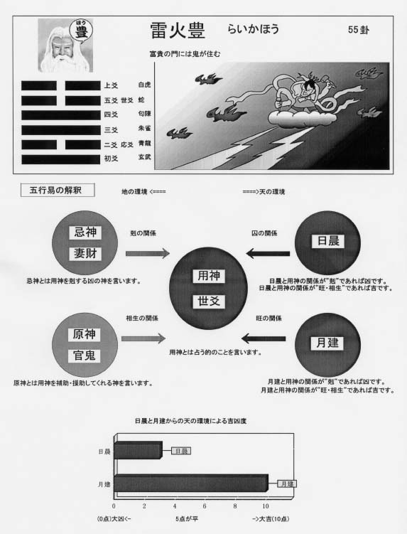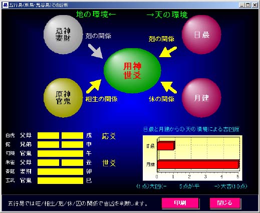 五行易は別名”断易”といわれる位に、吉と凶だけを決定する易です。従って、ど のように良いとかどのように悪いとかといった象意はありません。10点の大吉な のか5点の平なのか、1点の大凶なのか? といった吉凶をはっきりと結論づける ための易なのです。 この判断には、日晨と用神との五行的関係が一番重要です。次に月建と用神と の五行的関係が重要です。この2つで吉凶が決定されると理解しても大きな間違 いはありません。この吉凶がどの程度なのかは、グラフで表示されています。10点 が最大の吉。1点が最大の凶という目盛りになっていますので、ここで吉か凶を見 ます。凶だからどうしたらいいのか?といった対策の言葉やアドバイスは周易の ようにありません。決定するだけです。