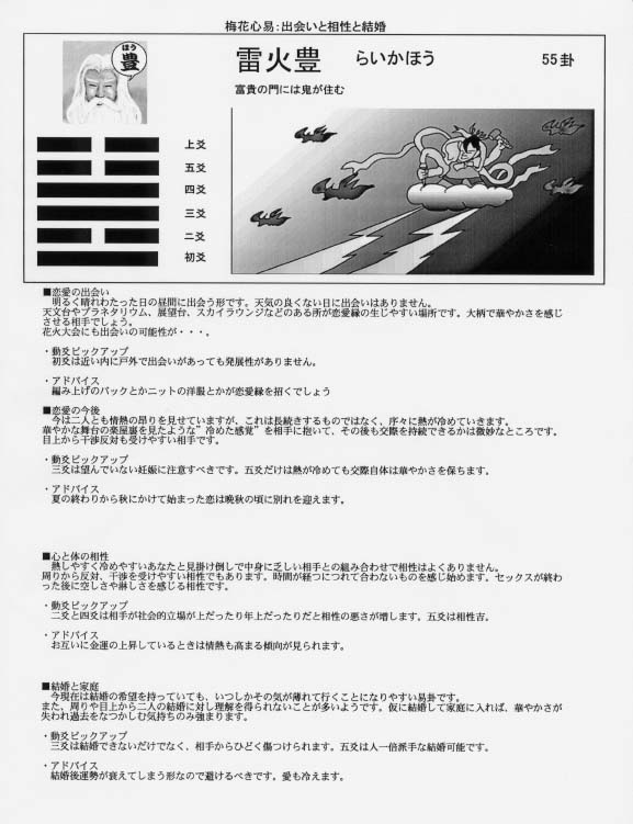 ー地風弁の三爻変ー 恋人とはトラブル続きなので別れようと思っているのですが、別れたらもう縁 がないような気がして迷っています。という女性に「地風弁の三爻変」が出ました。 そこで「これは縁がないどころか、今すぐにでも別の相手が出現してくる形が出 ているのですが、すでにこの人ならと思うような男性がいるのではありません か」「いいえ、そんな方はおりません。ただ、今の彼ともまだ別れていないのに、交 際を申し込まれている男性ならいますが・・・」「きっとその男性ですよ」「でも、あ まり私の好みではないのです」「ふたりだけで会ったり、話たりしたことはあるの ですか」「いいえ、実際にはどういう方なのか、よく解らないのです」「もし、二人 だけで会うのが嫌ならお友達も加えて三人で会ってみてはどうですか」それから 半年ほどして、彼女の友人が来て「先生によろしく伝えて下さいと頼まれました。 先生が占われた通り、とても良い方で5月には結婚されるそうです」と教えてくれ | |||||||||