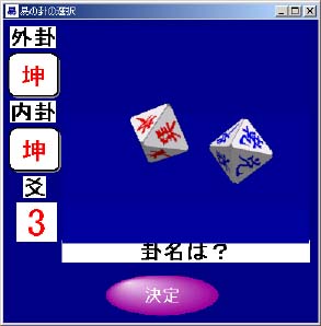 コンピュータが自動的にサイコロを回転させます。停止のタイミングをユー ザーが決定しなければなりません。適当な時間をおいてから、決定ボタンを押し て下さい。これだけで卦と動爻が決定されます。