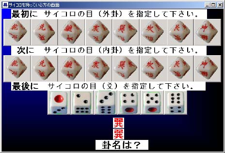 8面体と6面体のサイコロを所有していらっしゃるユーザは、最初に8面体のサ イコロを振って下さい。最初に出た目が外(上)卦になり、画面の該当するサイコ ロボタンを押して下さい。もう1回振って出た目が内(下)卦になります。画面の該 当するサイコロボタンを押して下さい。最後に6面体のサイコロを振って動爻を 決定します。画面の該当するサイコロボタンを押して下さい。8面体でも数字の書 いてあるサイコロをお持ちの場合は、数字を「乾兌・・」に直して選択して下さい。