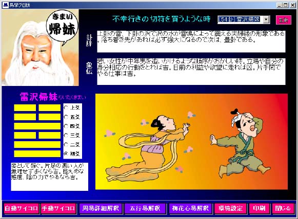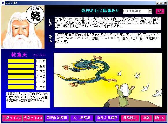 この画面は古典的な周易の解釈を説明しています。非常に抽象的な文章になっ ていますが、これは中国の原本(易経)がそうなっているからです。これを現代風 に解釈したい場合は、「周易詳細解説」ボタンを押して下さい。