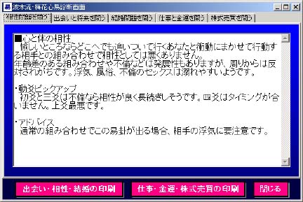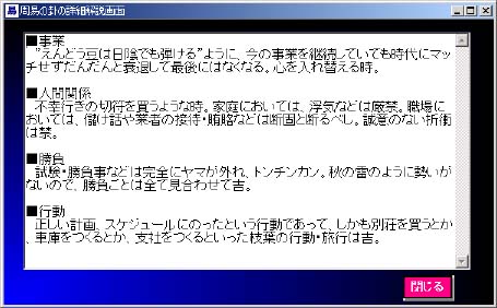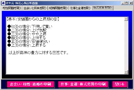 「梅花心易解釈」ボタン この画面が一番色々な分野の文章表示ができる画面になっています。またこの梅 花心易に関しては、波木星龍先生から原稿を頂き、開発しております。