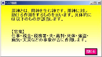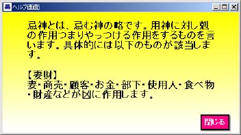 また、用神を剋すものが、忌神で、用神を生じるものが原神なのですが、忌神と 原神が実際にはどのような内容なのかは、忌神と原神ボタンを押すことによっ て説明画面が表示されます。 忌神の説明画面 | |||||||||