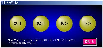 卦が色々とあります。それを参照したい場合には「生卦」ボタン それぞれの4ツのボタンのいづれかを押すと卦が変化することもありますし、し ない場合もあります。ここは参照程度に見ると良いでしょう。