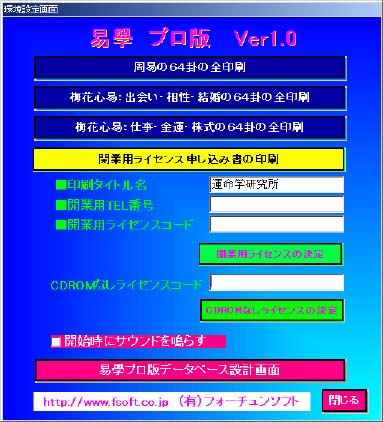 開業用ライセンス(8,000円)を取得すれば、印刷物を有料で配布できるように なります。開業用ライセンスを取得しない場合は、印刷物を有料・無料を問わず配 布することはできません。 さらに、データベースを変更できるようになりますので、自分で文章を変更し たり追加することも可能になります。易學というのは、1000人の鑑定士がいれば、 1000通りの解釈があって良い学問ですから、自分流を確立されている方は、開業 用ライセンスを取得して自分流に文章を変更すれば自分だけの文章が表示・印 刷できるソフトに変更していくことができます。