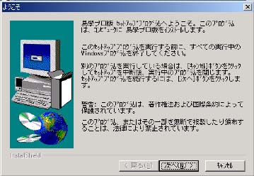 起動すると次のような画面になります。この画面が出てこない場合も”正常”に インストールが完了していません。または、プリンタドライバーが組み込まれてい ない場合も正常に起動できない可能性があります。必ずプリンタは接続して、ドラ イバーを組み込んでおいて下さい。一度プリンタから正常出力を確認すれば、常 時接続しておく必要はありません。 | |||||||